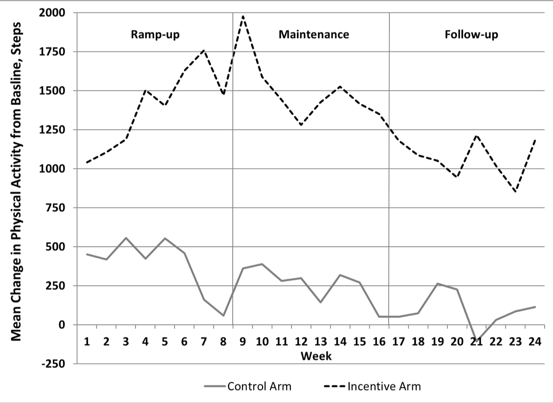 Intervention - Patients in control received no other interventions. Patients in the incentive arm received personalized step goals and daily feedback for all 24 weeks. In the ramp-up incentive phase, daily step goals increased weekly by 15% from baseline with a maximum of 10 000 steps and then remained fixed. Each week, $14 was allocated to a virtual account; $2 could be lost per day for not achieving step goals.