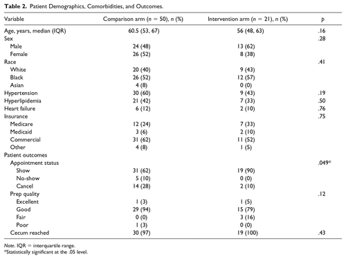 Of 22 patients successfully contacted, 21 agreed to participate in the text message intervention (one declined because of reported familiarity with the colonoscopy process), and 50 patients were randomly selected as the comparison arm. There were no significant differences in demographics or comorbidities between groups (Table 2). Intervention patients were significantly more likely to show for colonoscopy (90% vs. 62% show rate; p = .049). This difference persisted on secondary analysis when the patient who declined the intervention was included (91% vs. 62% show rate, p = .040). There were 2 cancellations and 0 no-shows in the intervention group as compared with 14 cancellations and 5 no-shows in the comparison group. Among those who showed, there were no significant differences in preparation quality or completeness between arms (p = .12 and p = .43, respectively).