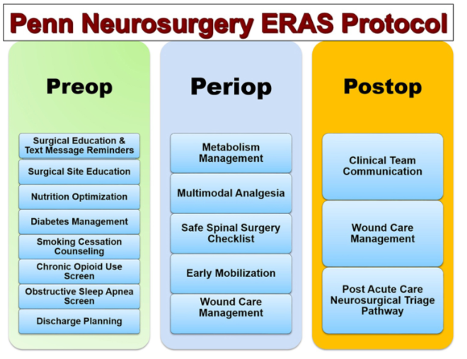 Intervention - The authors conducted a prospective cohort analysis comparing clinical outcomes of patients undergoing elective spine or peripheral nerve surgery after implementation of the ERAS protocol compared to a historical control cohort in a tertiary care academic medical center. Patients in the historical cohort (September–December 2016) underwent traditional surgical care. Patients in the intervention group (April–June 2017) were enrolled in a unique ERAS protocol created by the Department of Neurosurgery at the University of Pennsylvania.