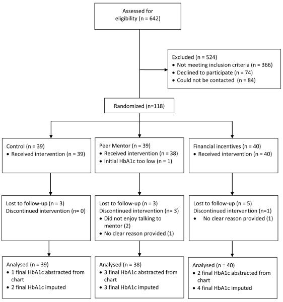 Intervention - 118 participants were randomized to one of the three arms. Usual care participants were notified of their starting HbA1c and recommended goals for HbA1c. Those in the peer mentor arm were assigned a peer mentor who formerly had poor glycemic control but now had good control (HbA1c < 7.5%) who was asked to talk with the participant at least once a week. Peer mentors were matched on race, sex, and age. Those in the financial incentive arm could earn $100 by dropping their HbA1c by one point and $200 by dropping it by two points or to a HbA1c of 6.5%.