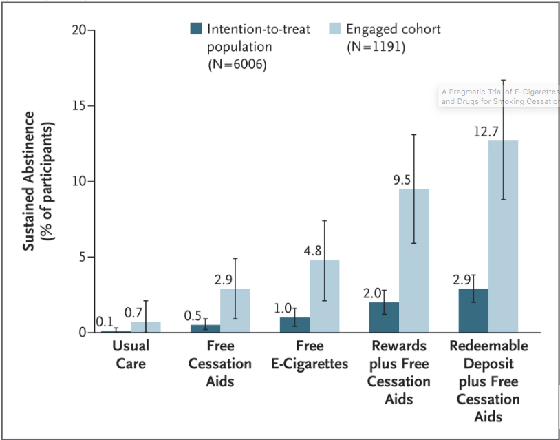 Intervention - The four interventions consisted of usual care plus one of the following: free cessation aids (nicotine-replacement therapy or pharmacotherapy, with e-cigarettes if standard therapies failed); free e-cigarettes, without a requirement that standard therapies had been tried; free cessation aids plus $600 in rewards for sustained abstinence; or free cessation aids plus $600 in redeemable funds, deposited in a separate account for each participant, with money removed from the account if cessation milestones were not met.
